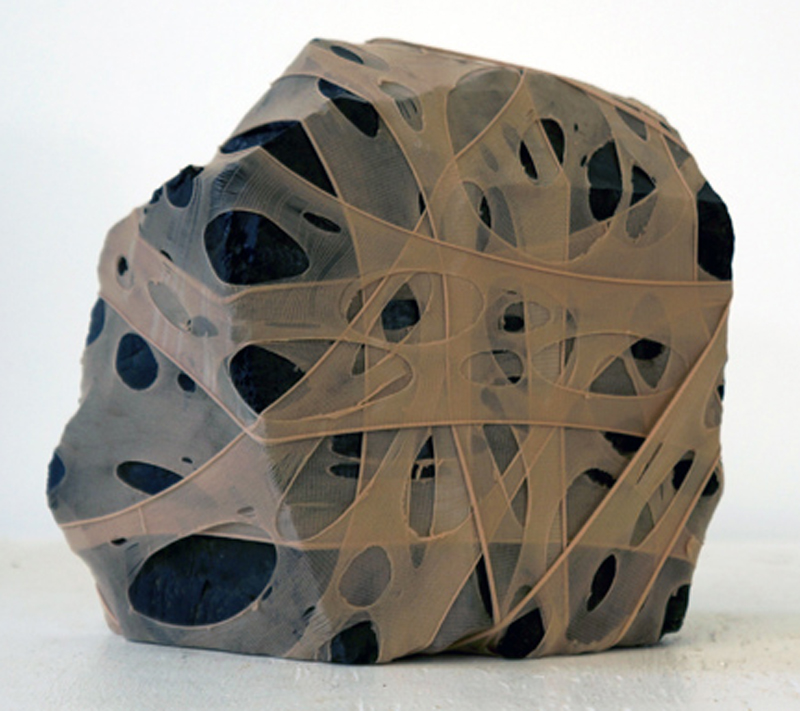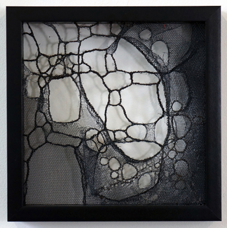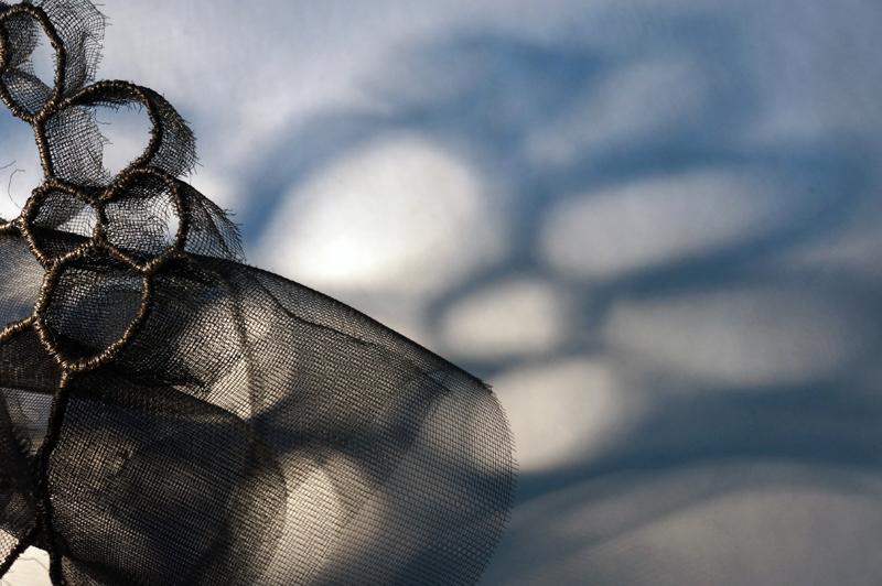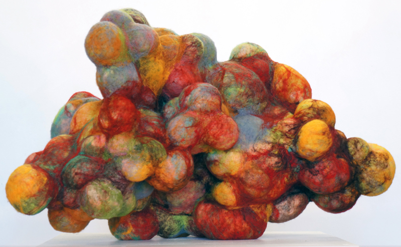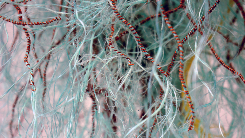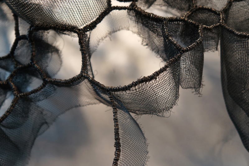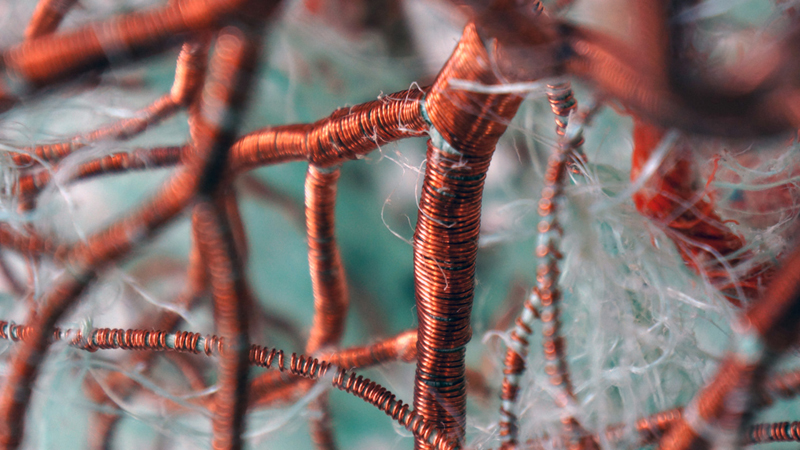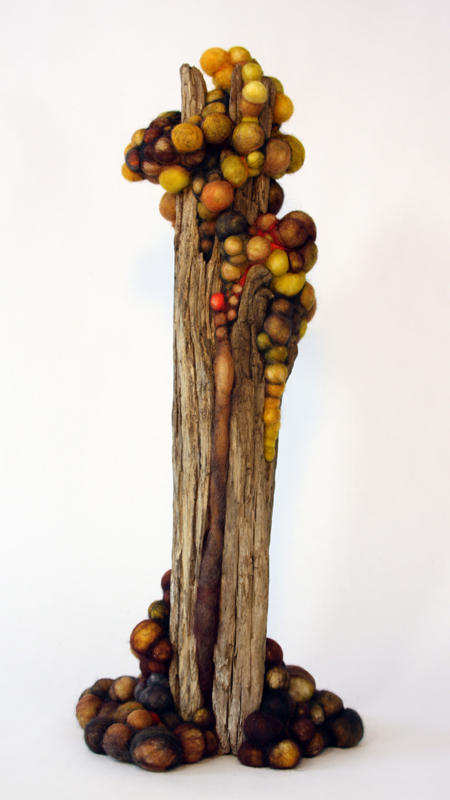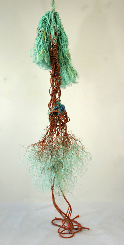 Found fishing ropes morph into nerve capillaries, tubes of screen congregate into honeycomb, and wool grows from the crevices of driftwood - as if creating new species. The repetitive handwork techniques mimic the incremental growth and accumulations that happen in nature. I want to engage - to create a physical attraction that beckons the viewer to "touch" and be "touched" by what they see.”