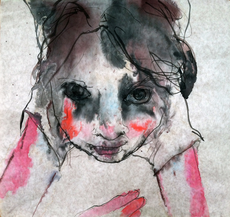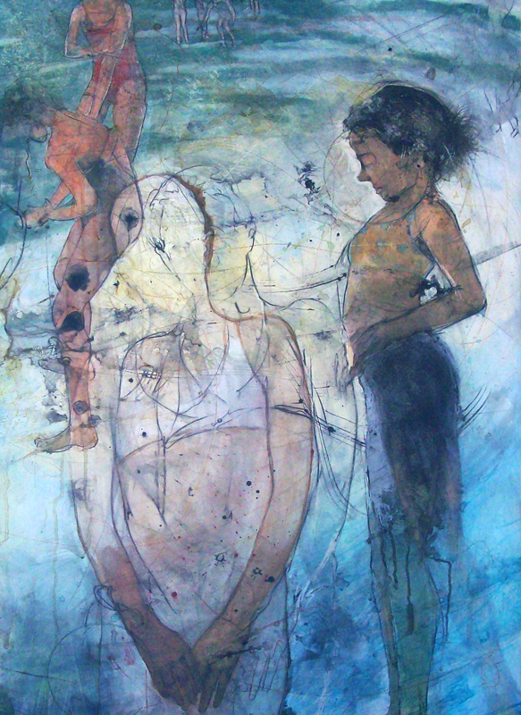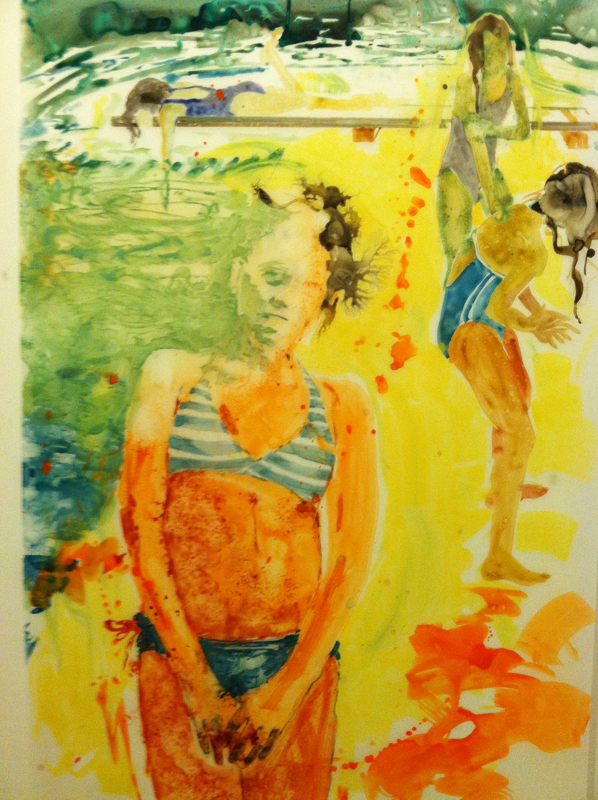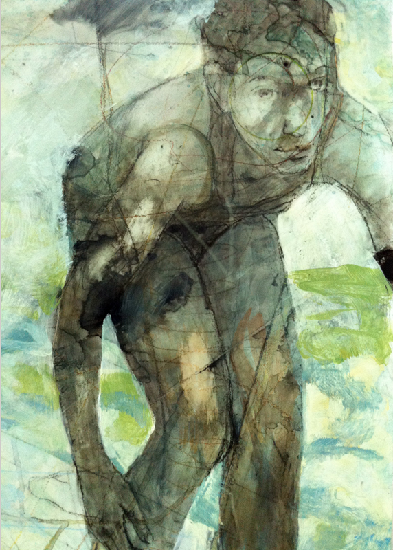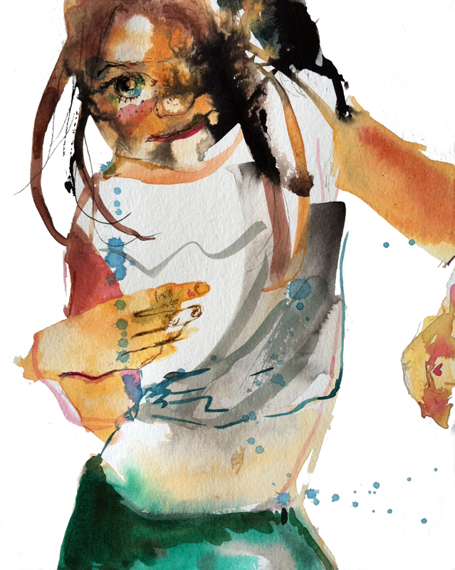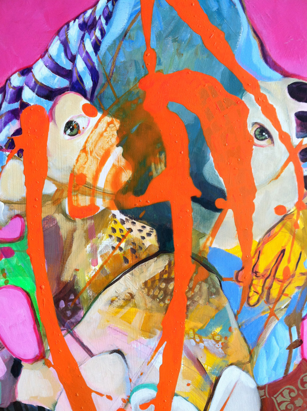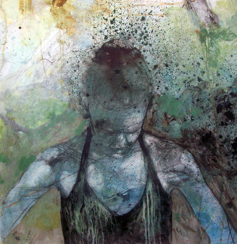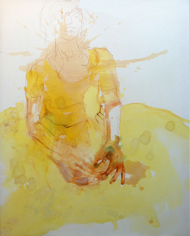 I use materials and processes that show evidence of chance and spontaneity. Whether it’s spills of paint on canvas, pooling watercolor on mylar or ink bleeding into rice paper, the unpredictable outcome becomes the playground where I bring abstract and figurative elements together to co-mingling in a space.