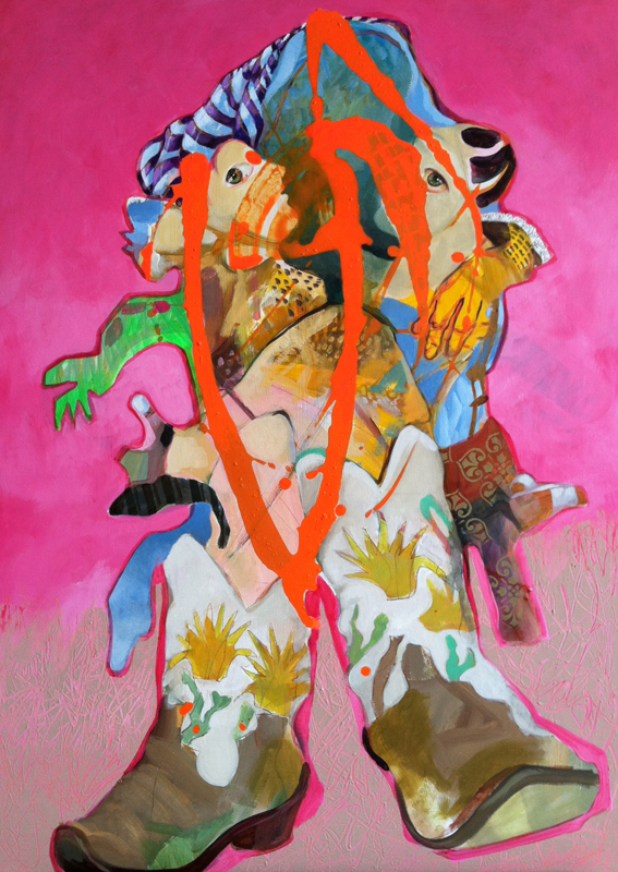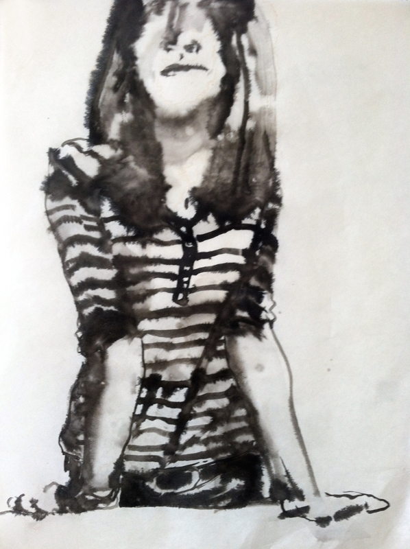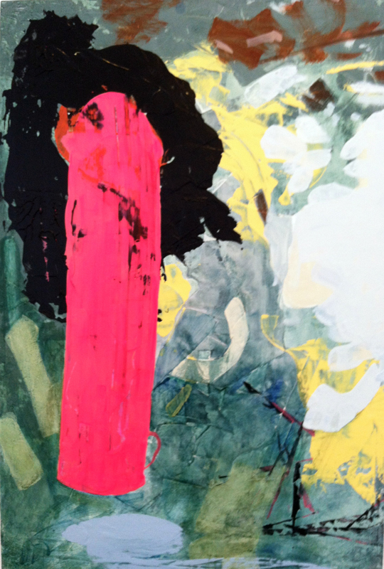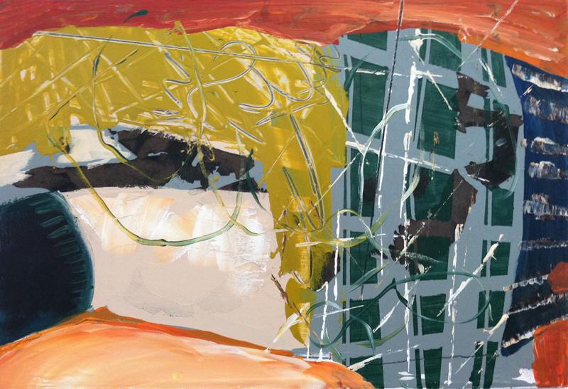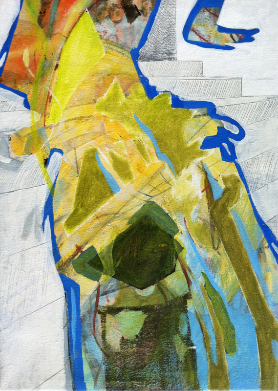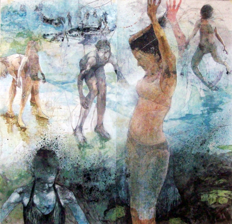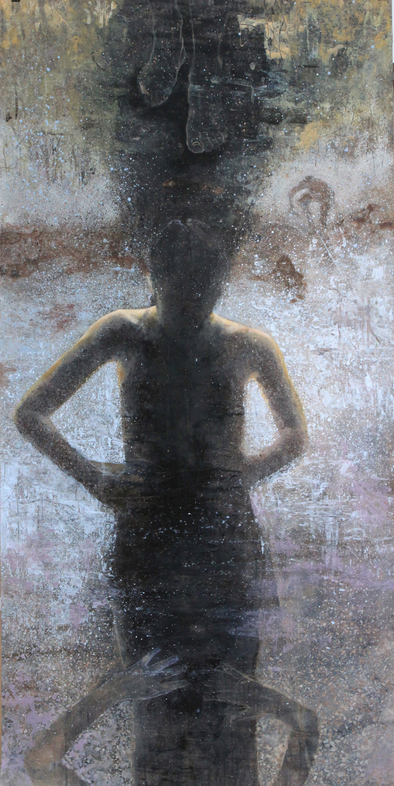 I use materials and processes that show evidence of chance and spontaneity. Whether it’s spills of paint on canvas, pooling watercolor on mylar or ink bleeding into rice paper, the unpredictable outcome becomes the playground where I bring abstract and figurative elements together to co-mingling in a space.