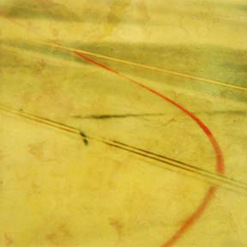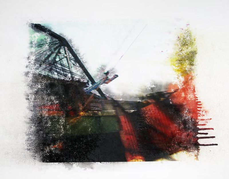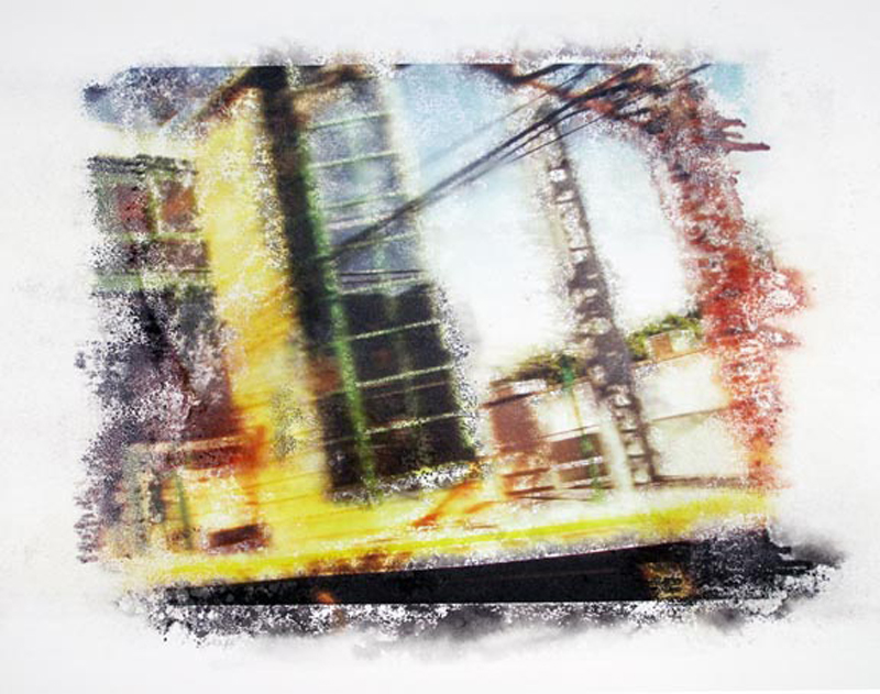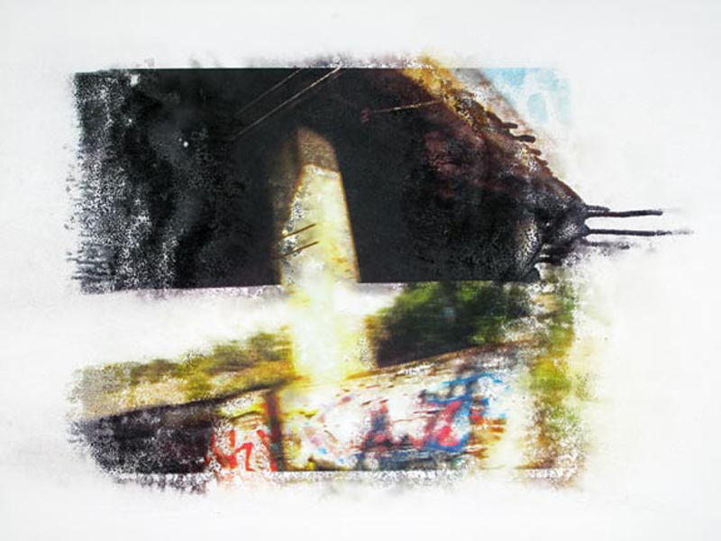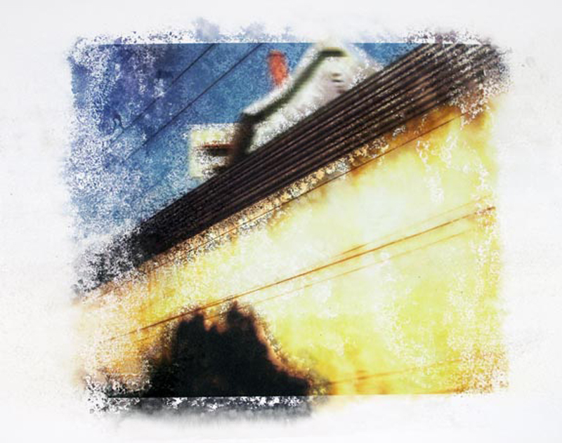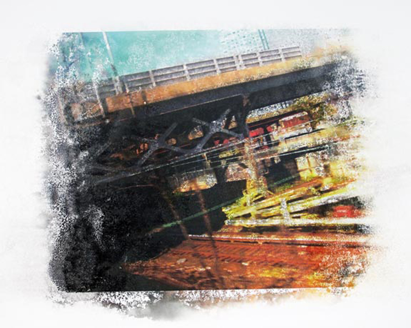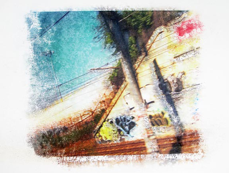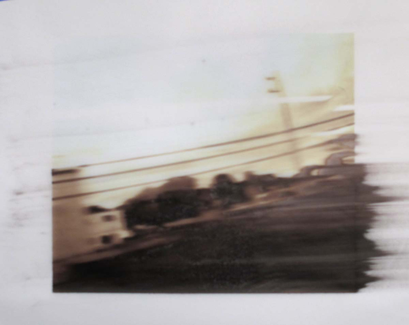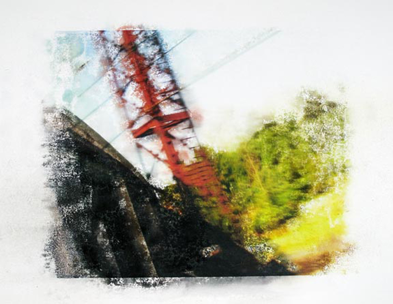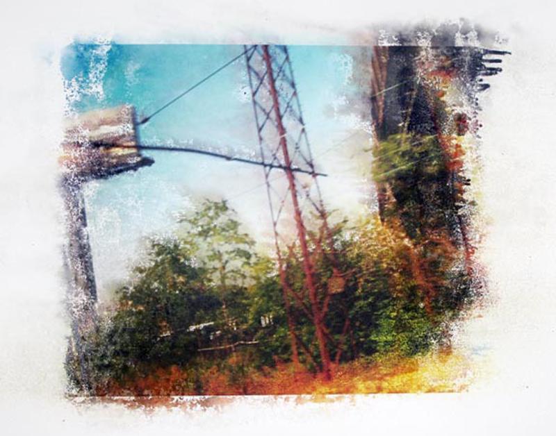 Taken from trains, these photographs capture glimpses of the landscape streaming past. The arch of a bridge, some power lines, a stand of trees on a hill.