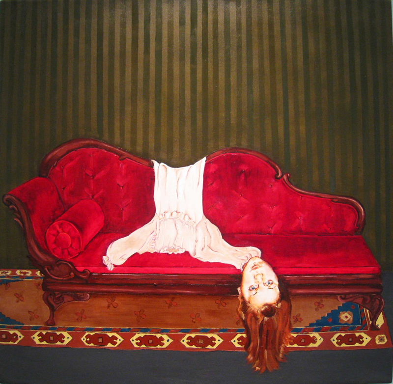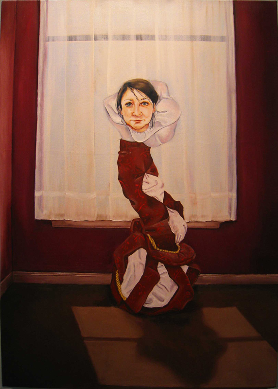 My paintings are portraits, in which the figures become hybrids of individuals and garments, exploring the struggle between the adornments and the bodies, and altering the role each plays in the creation of an identity. In these images, the dominating subject of the portrait blurs between the individual and the garment. The garments start to wear the body, rather than the body wearing the garment.